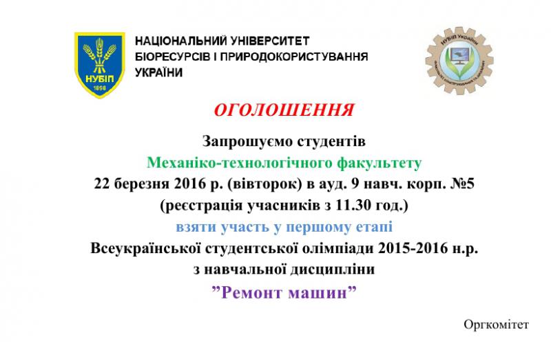 Запрошуємо студентів на олімпіаду з навчальної дисципліни ”Ремонт машин”.