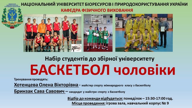 Запрошуємо студентів першокурсників до занять у спортивній секції баскетбол чоловіки 5 жовтня 2020 року 03:00 - 03:00