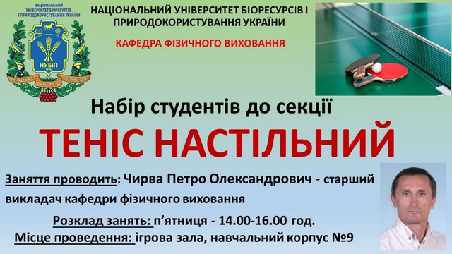 Запрошуємо студентів зо занять у спортивній секції тенісу настільного 29 вересня 2020 року 03:00 - 03:00