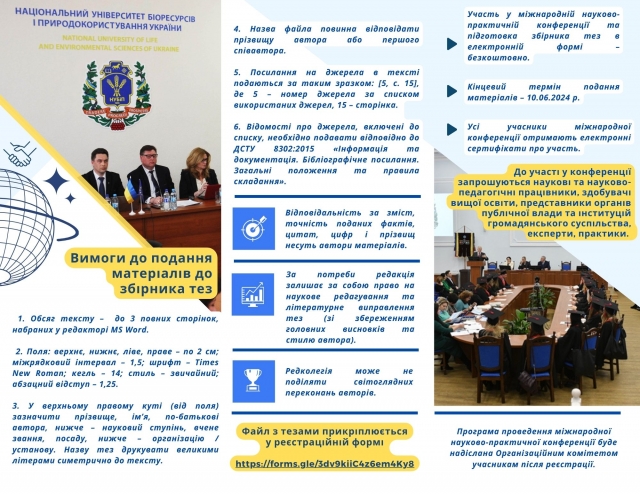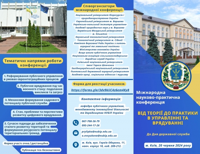 20 червня 2024 року на кафедрі публічного управління, менеджменту інноваційної діяльності та дорадництва Національного університету біоресурсів і природокористування України відбудеться Міжнародна науково-практична конференція «Від теорії до практики в управлінні та врядуванні» за участі представників органів публічної влади, науковців, експертів, практиків та членів Ради роботодавців ННІ неперервної освіти і туризму НУБіП.