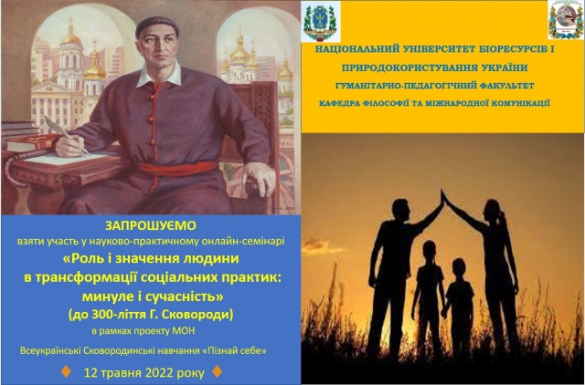 Запрошуємо взяти участь у науково-практичному семінарі "Роль і значення людини в трансформації соціальних практик: минуле і сучасність" (до 300-ліття Г. Сковороди)