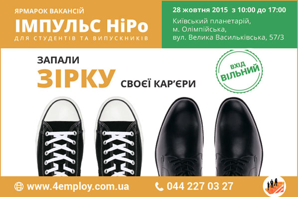 Ярмарок вакансій "Імпульс-Hipo" проводиться на території Київського планетарію 28 жовтня 2015 року з 10:00 до 17:00 годин за адресою: м. Київ, вул. Велика Васильківська, 57/3, що біля станції метро "Олімпійська".