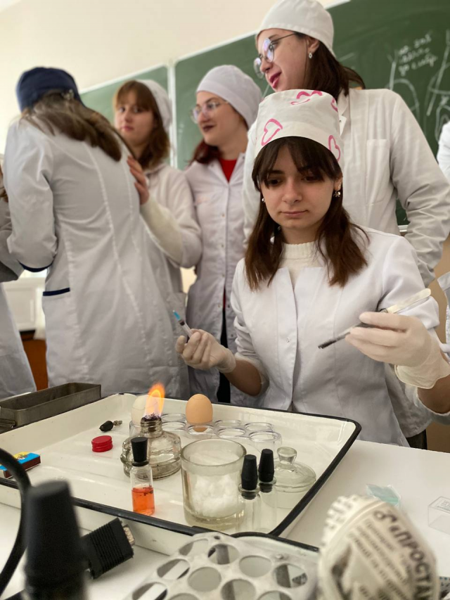 Тема засідання: Зараження курячих ембріонів патогенною мікрофлорою.    Під час засідання гуртка у студентів була змога ознайомитися курячими ембріонами , дізнатися скільки часу потрібно для формування ембріона ,а також вони власноруч здійснювали зараження . Курячі ембріони використовуються як чутлива біологічна система для дослідження вірусних інфекцій. Під час зараження ембріонів патогенною бактеріальною мікрофлорою, гуртківці здійснювали : алантоїсне введення , жовткове введення , амніотичне введення , хоріоналлантоїсне введення, що  дозволило варіювати спосіб інфікування та вивчати особливості взаємодії патогенної мікрофлори з різними тканинами. Після інокуляції курячі ембріони інкубували при температурі 37°C  впродовж декількох діб і спостерігають за розвитком патологічного процесу на наступному засіданні гуртка.    Зараження курячих ембріонів патогеном є важливим інструментом для вивчення біології цих мікроорганізмів. Методика інфікування ембріонів дозволяє дослідити механізми впливу, оцінити патогенний потенціал різних штамів. Гуртківцям неймовірно сподобалося отримати новий досвід та удосконалити свої знання та практичні навики. Староста гуртка Софія Ярошенко