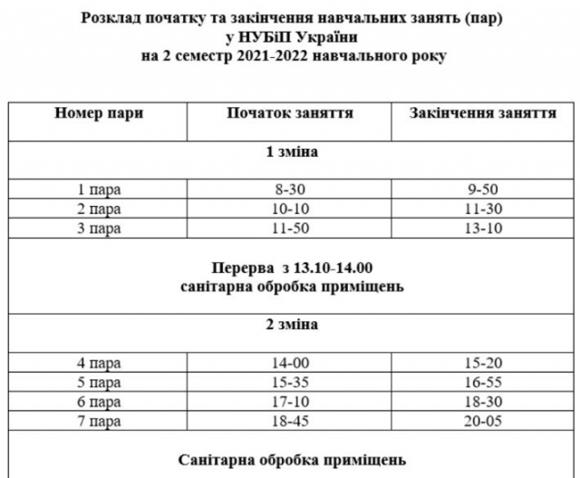 Повторно звернули увагу на розклад початку та закінчення навчальних занять (пар), а також робочий розклад занять.