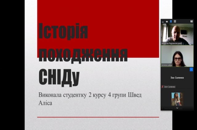 29 вересня 2022 р. на платформі Zoom відбулося засідання гуртка, під час якого обговорили проблему одного з найрозповсюдженіших вірусних захворювань ХХ століття - СНІД. З доповіддю про історію походження СНІДу виступила студентка 2 курсу 4 групи Швед Аліса. Слід відмітити значну активність і цікавість студентів, адже обговорення теми проходило у вигляді жвавої дискусії.