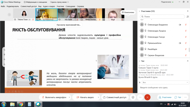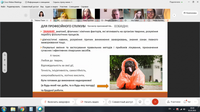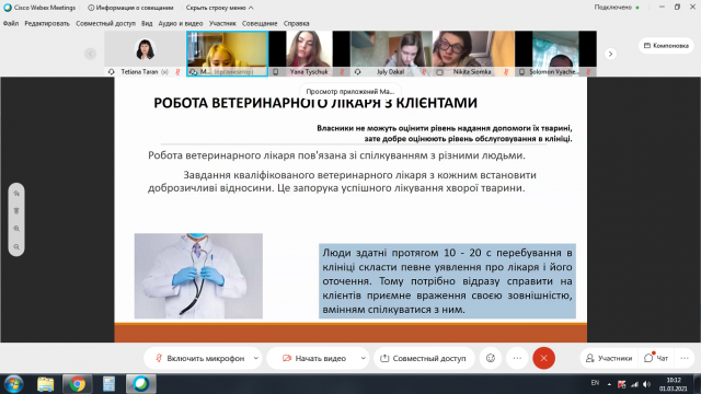 1 березня 2021 року відбулася відкрита оn-line лекція з дисципліни «Благополуччя тварин, етологія, професійна етика» на тему «Службове спілкування лікаря ветеринарної медицини» для студентів 5-6 групи 3 курсу факультету ветеринарної медицини, спеціальності 211 «Ветеринарна медицина», з використанням платформи Cisco Webex. Лектор – завідувач кафедри ветеринарної гігієни ім. проф. А.К. Скороходька, кандидат ветеринарних наук, доцент Кучерук Марія Дмитрівна.