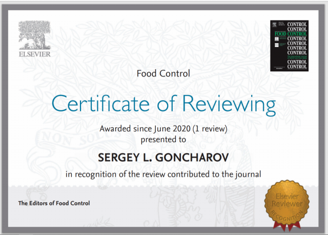 Докторант кафедри фармакології, паразитології і тропічної ветеринарії Сергій Гончаров отримав сертифікат, який підтверджує те, що він є рецензентом у міжнародному науковому журналі Food Control (Scopus, CiteScore 8.4, Impact Factor 4.258).
