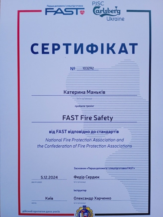 З 3 по 5 грудня в стінах нашого університету пройшов триденний курс «Школа безпеки» від Carlsberg Ukraine та Fast Ukraine. У якому взяла участь і Катерина Маньків – учасниця гуртка «Фітопатологія», студентка освітньої програми Захист і карантин рослин.