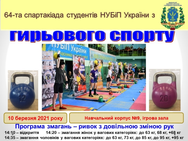 10 березня 2021 року в навчальному корпусі №9 відбудуться змагання з гирьового спорту за програмою 64-ої спартакіади студентів НУБіП України.