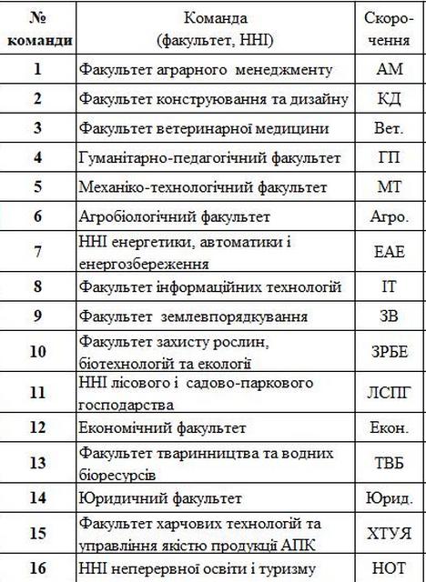 Учасники. Змагання командні. В змаганнях беруть участь збірні команди 3 навчально-наукових інститутів і 13 факультетів університету. Від ННІ, факультету допускається 1 команда. Склад команди – 10 студентів з них 3 дівчини і 7 хлопців. У спартакіаді студентів НУБіП України беруть участь збірні команди факультетів, ННІ до складу яких входять студенти, слухачі магістратури, аспіранти денної форми навчання, випускники магістратури, аспірантури поточного навчального року. Спортсмен несе особисту відповідальність за стан власного здоров’я.