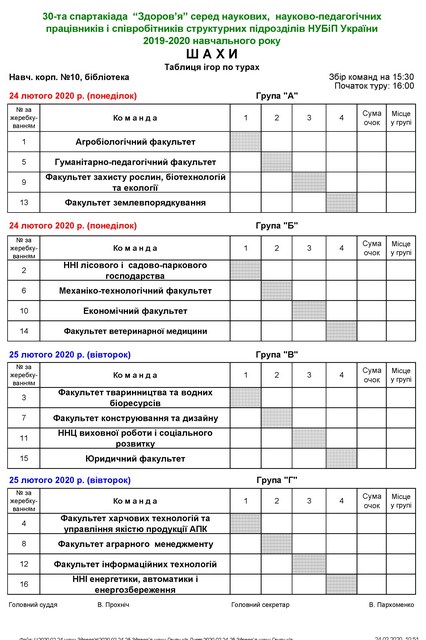 починаються змагання 30-ої спартакіади “Здоров’я” серед науково-педагогічних, наукових працівників і співробітників структурних підрозділів НУБіП України 2019-2020 навчального року з шахів.