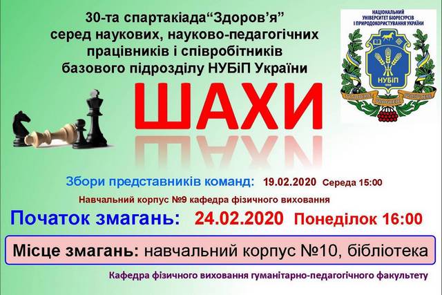 Змагання з шахів 30-ої спартакіади “Здоров’я” НУБіП України відбудуться у навчальному корпусі №10 (бібліотека) з 24 лютого 2020 року