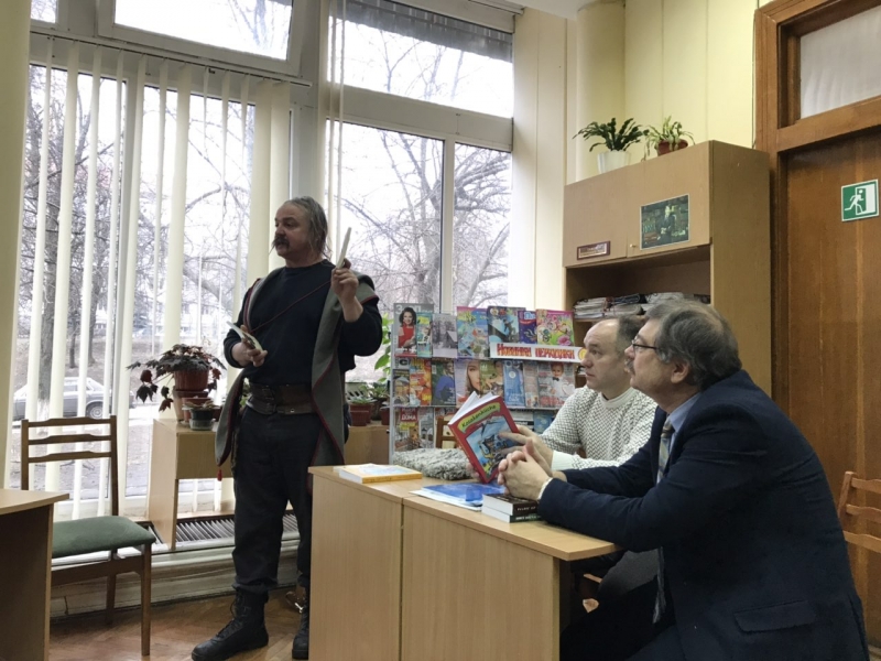 Руслан Анатолійович – надзвичайно цікава і колоритна особистість. Народився він у Семипалатинську, тому про перші роки життя згадує як про роки на полігонах ядерних випробувань у степах Казахстану, потім був переїзд на Одещину, до і проявилася творча душа і обдарування юнака. Під час навчання в Українській академії мистецтв (кафедра скульптури) його поглинув вир ренесансних дев’яностих. Кінні та піші краєзнавчі та етнографічні походи, відродження українського козацтва,кобзарський цех Миколи Будника – усі ці віхи за плечима митця. «Вивчення прадавніх цивілізацій, - розповідав Руслан Анатолійович, - привело мене в Америку, де разом з дружиною Лесею Гончар ми багато подорожували Месоамерикою, вивчаючи культури майя, ацтеків та інків. Мав численні виставки скульптури і графіки і на тому континенті, і в Європі. Близько десяти років ми проживали та працювали в м. Балтиморі, там були написані «Казки портового міста» і роман «Балта-Бруклін-Балтимор» про реалії іммігрантського життя.» Та рідна земля покликала повернутися. Після повернення на Батьківщину впродовж останніх п’яти років Руслан Найда написав повість «Редут» про будні зимових барикадах Євромайдану, «Козацький роман» і кулінарний бестселер «Козацька кухня» та інші твори, які вийшли у видавництві «Ярославів Вал», були презентовані студентам і дуже їх зацікавили. Нині митець ілюструє книги, створює героїчну скульптуру українського степу зі сталі. Але основне його захоплення – козакування. Разом з однодумцями він самовіддано працює над розвитком козацьких поселень на Подніпров’ї. Один із таких однодумців - український громадсько-політичний діяч, науковець, публіцист, бард, заслужений діяч мистецтв України Володимир Гонський - приєднався до аудиторії під час зустрічі, і тоді студентство почуло ще й неймовірно мелодійні козацькі пісні. Зустріч захопила її учасників, адже пройшла жваво, невимушено, навіть весело, хоча проблеми, яких торкалися її учасники, були досить серйозними, - родина, Батьківщина, нація, патріотизм. Студенти вдячні Державній бібліотеці України для юнацтва та доценту кафедри культурології Тетяні Михайлівні Мисюрі за її організацію.