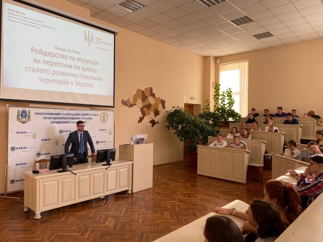 6 вересня 2023 р. на юридичному факультеті відбулася зустріч з начальником відділу правового забезпечення Вищого антикорупційного суду, к.ю.н. Артемом Брінцовим, організована професором кафедри аграрного, земельного та екологічного права ім. академіка В.З. Янчука Оленою Гафуровою. Студенти отримали можливість прослухати лекцію на тему: «Рейдерство та корупція як перепони на шляху сталого розвитку сільських територій в Україні».