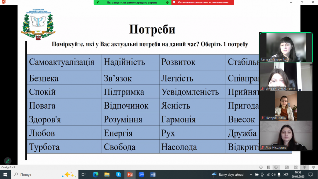 29 січня 2025 року відбулась чергова зустріч учасників «Клубу самопізнання та саморозвитку «Вutterfly»», присвячена обговоренню та визначенню власних потреб, стратегій їх задоволення, пошуку ресурсів та особистісних опор. Ця тема набуває актуальності в умовах сьогодення, коли в країні йде війна, кожен із нас опинився в складних життєвих обставинах та стає основою для адаптації, зцілення та подальшого розвитку особистості.