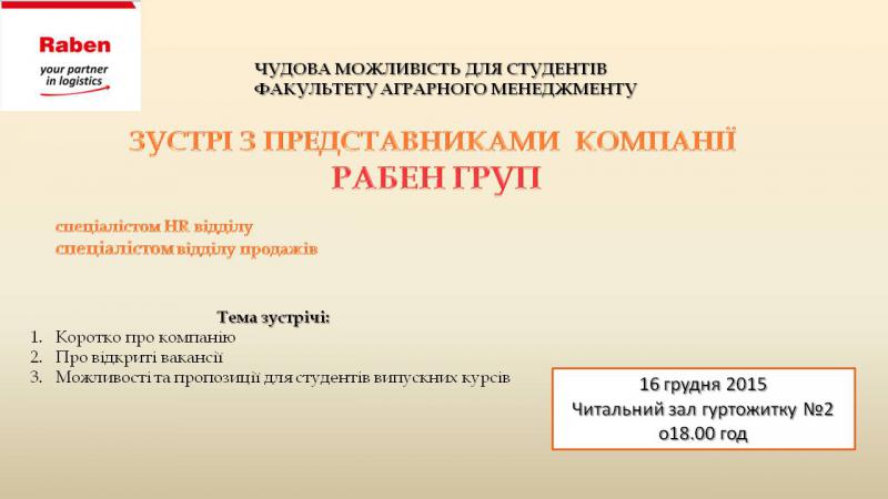 Зустріч представників РАБЕН ГРУП зі студентами факультету аграрного менеджменту 16 грудня 2015 року 02:00 - 02:00