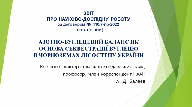 Першим презентував результати досліджень Анатолій Балаєв – науковий керівник державної тематики «Азотно–вуглецевий баланс як основа секвестрації вуглецю в чорноземах Лісостепу України». Під його керівництвом було визначенно вплив різних систем обробітку ґрунту та удобрення на особливості балансу вуглецю та азоту в чорноземах Лісостепу України та встановлено їх роль у секвестрації вуглецю в агроценозах. Встановлено, що критичний рівень співвідношення в удобренні C:N складає 10:1. Нижче цього рівня можуть відбуватися значні втрати азоту, що негативно впливає на грунт та довкілля. Велике співвідношення C:N призводить до втрати значної кількості вуглецю і посилення парникового ефекту. Результати модельного досліду показують, що діапазон співвідношення, за якого проходить інтенсивне удобрення гумусових речовин може коливатися від 12:1 до 30:1, тоді як оптимальним воно стає за 15-20:1 і навіть нижче, як у даному модельному досліді.