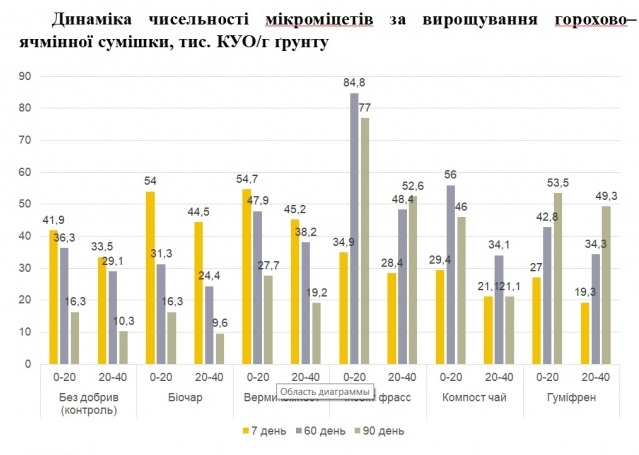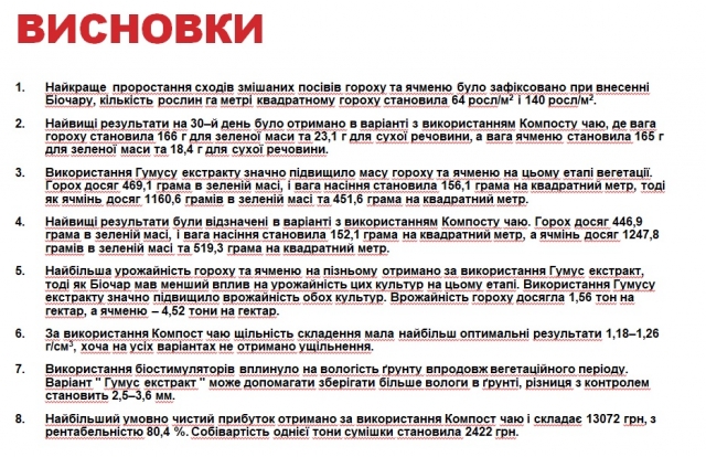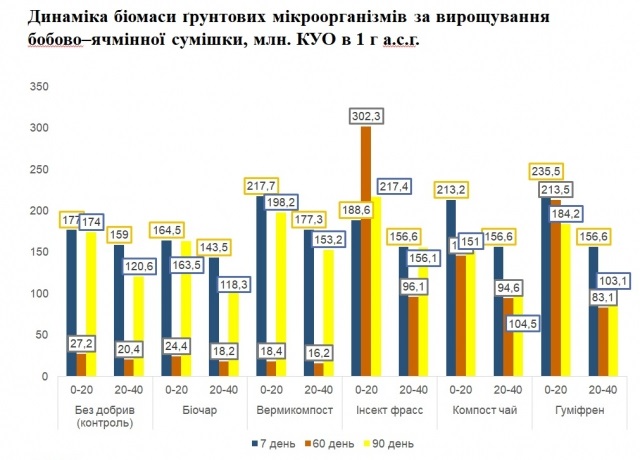 Найвищі показники біогенності чорнозему типового та звичайного отримано за використання біостимулятору Інсект фрасс, що обумовлюється зменшенням коефіцієнта мінералізації-іммобілізації на 21–32 %, педотрофних – до 40 % та гуматрозкладаючих мікроорганізмів – у 1,6 раза, а також підвищенням на 17 % коефіцієнта накопичення гумусу порівняно з контролем. Вирощування горохово-ячмінної суміші за використання біостимуляторів (Вермикомпост, Інсект фрас, Компост чай) призводить до покращення мікробіологічних властивостей, відбувається прискорений розвиток бактерій, особливо тих, які не культивуються на селективних середовищах. За використання компост чаю щільність складення ґрунту мала найбільш оптимальні результати 1,18-1,26 г/см3, хоча на усіх варіантах не спостерігається переущільнення. Також використання біостимуляторів достовірно вплинуло на вологість ґрунту впродовж вегетаційного періоду.