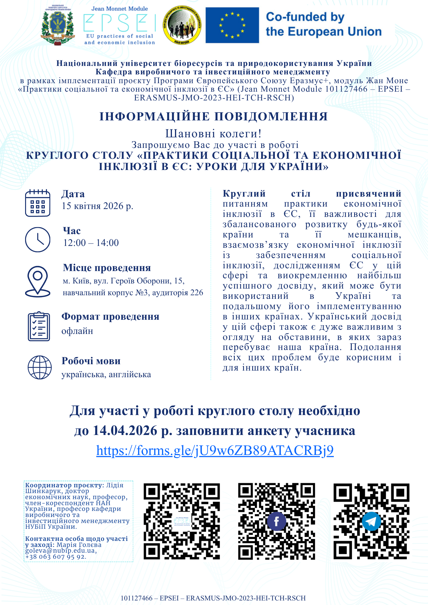Круглий стіл «Практики соціальної та економічної інклюзії в ЄС: уроки для України» 15 квітня 2026 року 12:00 - 14:00