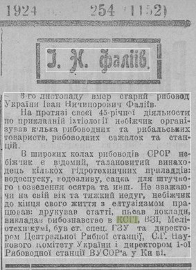 Некролог на смерть І.Н. Фалієва від 6.11.1924 р. - викладача рибознавства Київського сільськогосподарського інституту та Київського Ветеринарно-зоотехнічного інституту.