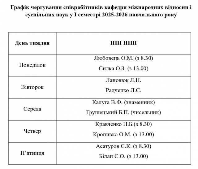 Графік чергування НПП кафедри МВіСН та розклад занять на І семестр 2025-2026 н.р.