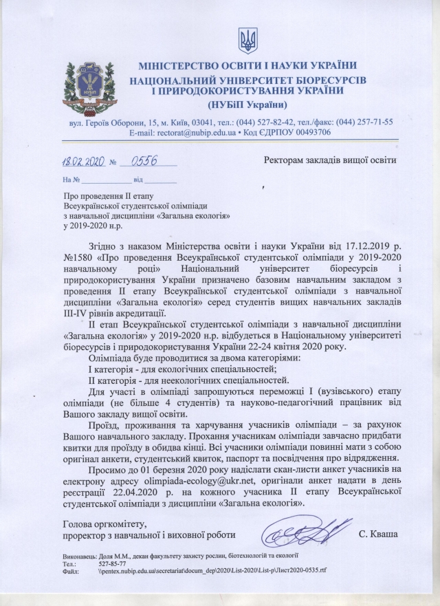 Відповідно до наказу Міністерства освіти і науки України від 17.12.2019 р. №1580 «Про проведення Всеукраїнської студентської олімпіади у 2019-2020 навчальному році» Національний університет біоресурсів і природокористування України призначено базовим навчальним закладом з проведення ІІ етапу Всеукраїнської студентської олімпіади з навчальної дисципліни «Загальна екологія» серед студентів вищих навчальних закладів ІІІ- ІV рівнів акредитації.