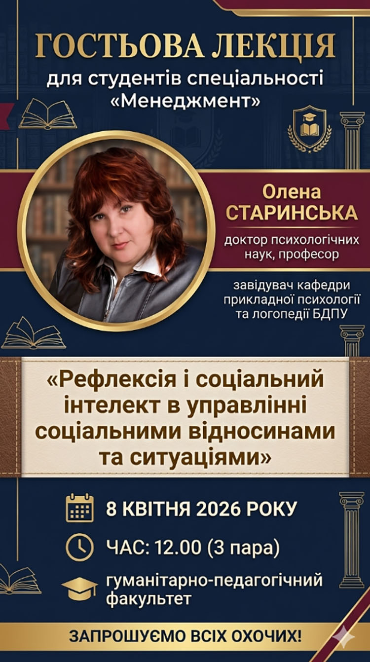 Запрошуємо на гостьову лекцію доктора психологічних наук, завідувача кафедри прикладної психології та логопедії Бердянського державного педагогічного університету Олени СТАРИНСЬКОЇ 8 квітня 2026 року 11:50 - 13:10