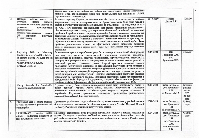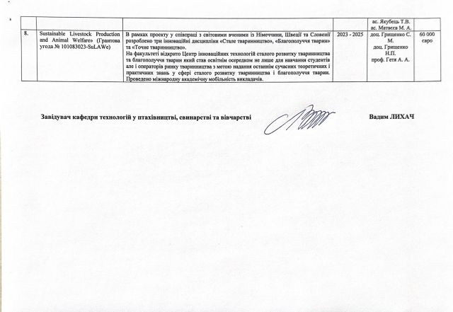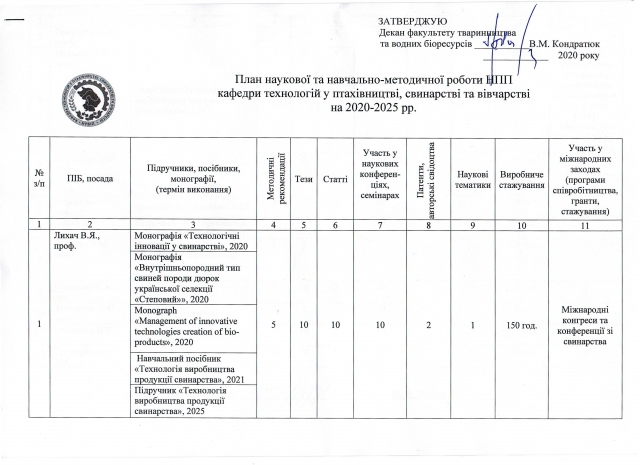 За методи створення і селекції Української м’ясної породи великої рогатої худоби її внутрішньо породний заводський тип та 6 заводських ліній кафедра технологій виробництва молока та м’яса нагороджена Золотою медаллю ХХІІ Міжнародної агропромислової виставки у номінації інноваційні розробки у галузі аграрної науки.