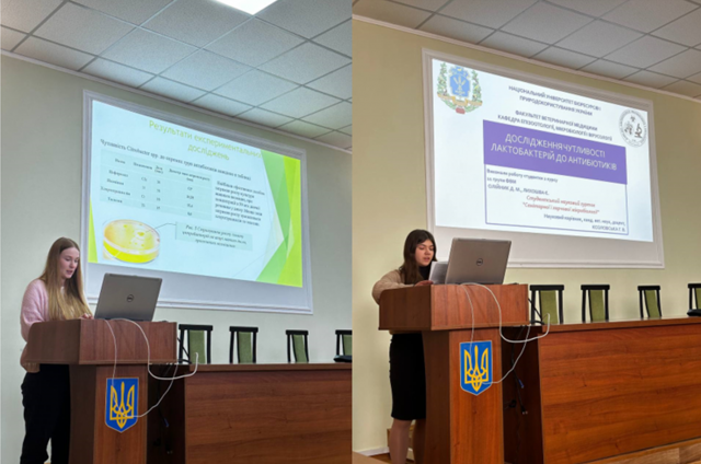 3 - МІСЦЕ: Лихошва Єлизавета Андріївна та Олійник Дарія Михайлівна (2 курс 11 група), науковий керівник: Козловська Ганна Володимирівна, кандидат ветеринарних наук, доцент. Науковий гурток: «Санітарна і харчова мікробіологія» на тему: «Дослідження чутливості лактобактерій до антибіотиків» кафедра епізоотології, мікробіології і вірусології