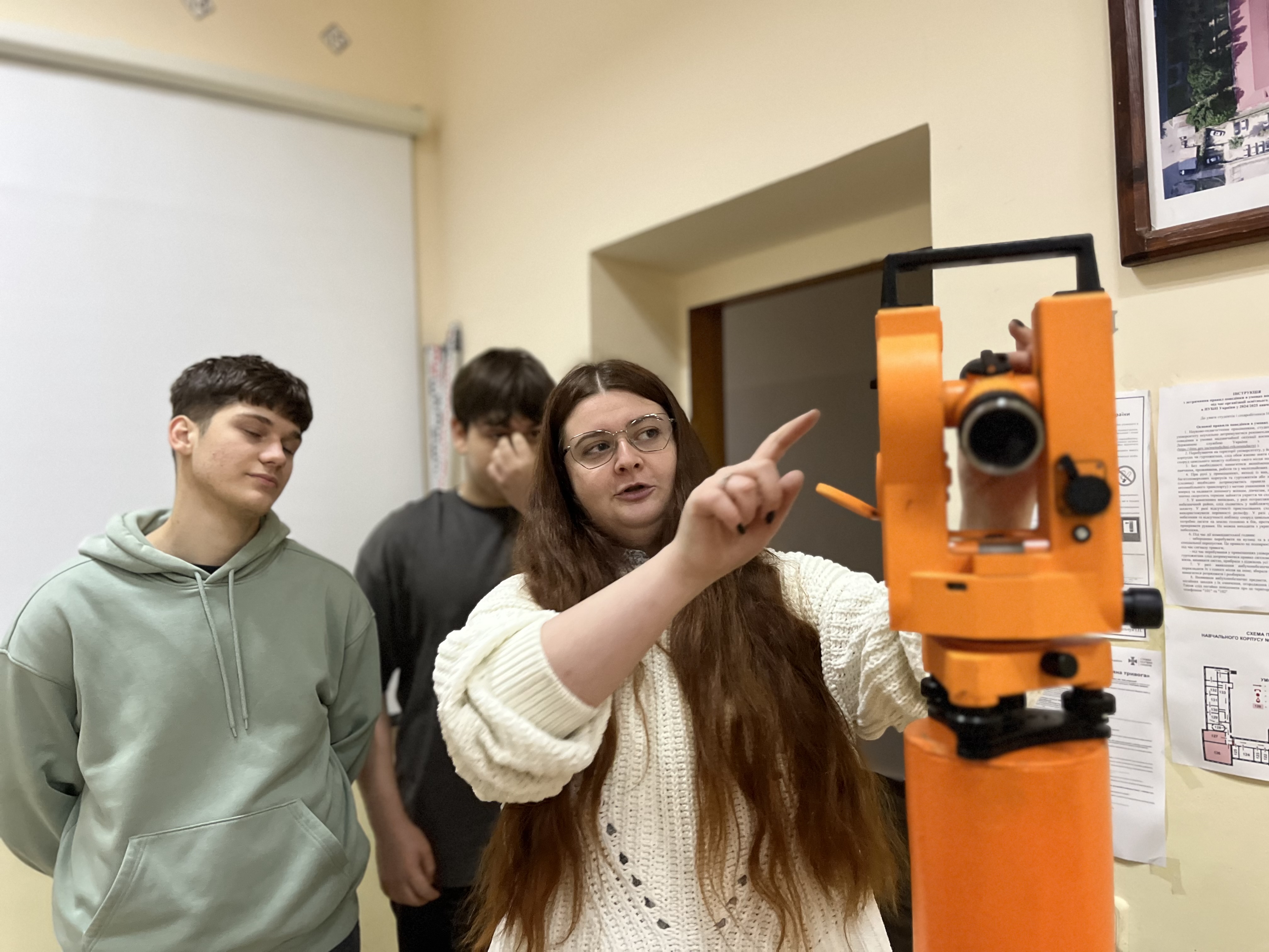 Гості оглянули матеріальну базу та взяли участь у інтерактивній лекції асистентки кафедри геодезії та картографії Яніни БОГДАН «Від теодоліта до GNSS». Учні познайомилися з сучасним геодезичним обладнанням, спробували себе в ролі геодезистів: навчились наводитись на точку за допомогою теодоліта та навіть змагалися у вправі «зняти кут на око».