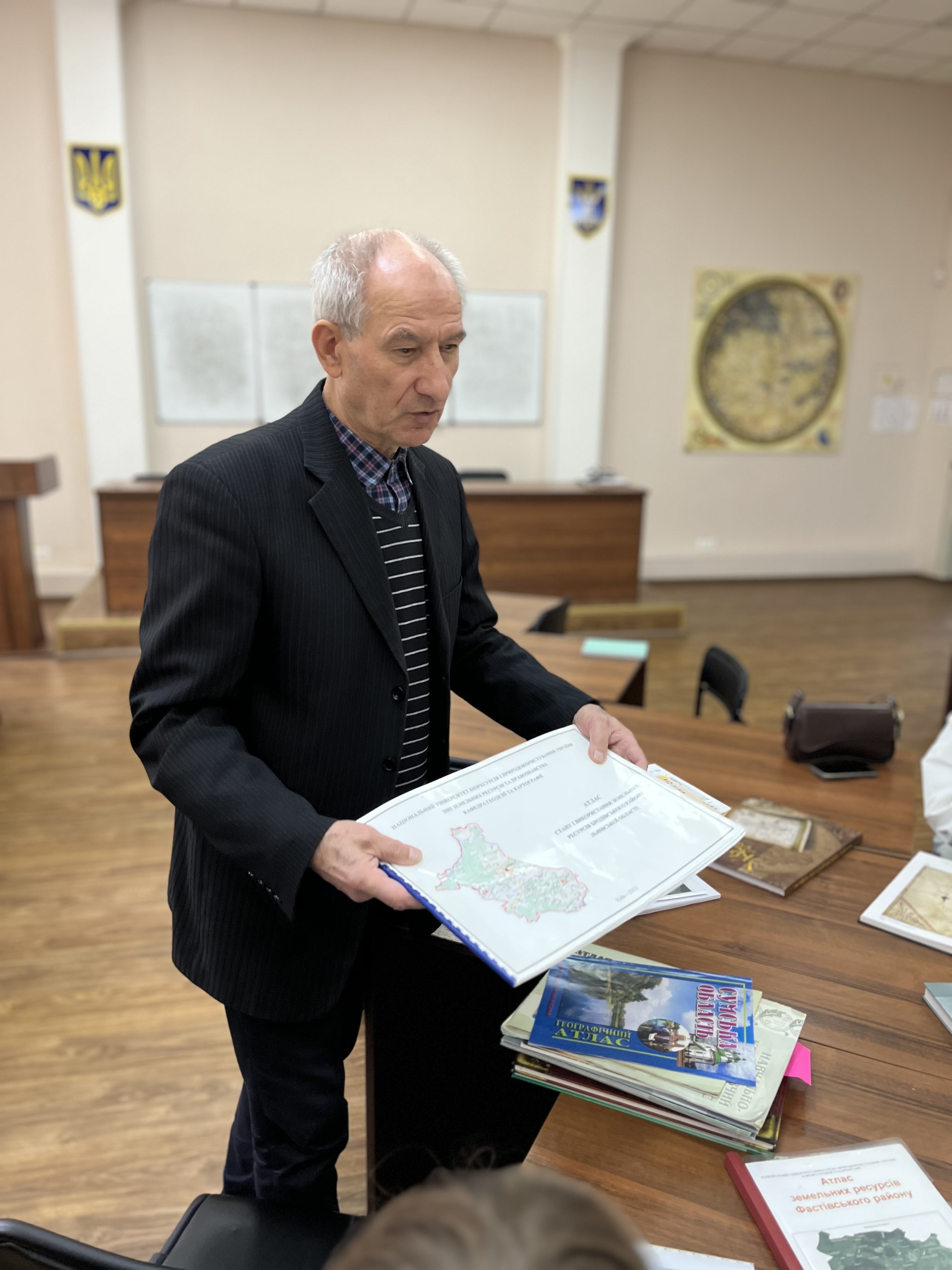 Після перерви школярі прослухали лекцію професора кафедри геодезії та картографії Івана КОВАЛЬЧУКА «Сучасна географія — її напрями, функції, суспільне значення, зв'язок із землевпорядкуванням і суміжними професіями». Іван Платонович показав різні карти й атласи та наголосив, що картографія є невід’ємною складовою землевпорядкування: саме вона забезпечує фахівців просторовими даними для аналізу територій, планування використання земель і створення кадастрових систем.