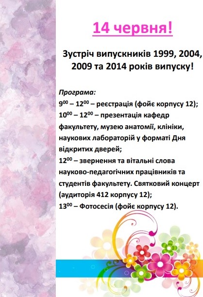 14 червня – день зустрічі випускників факультету ветеринарної медицини! Наталія Михайленко вт, 11 чер 2019 - 03:00
