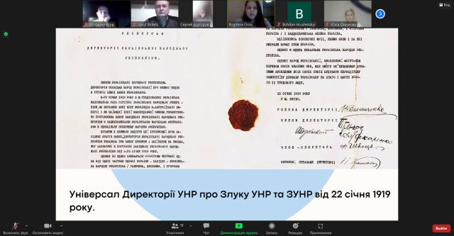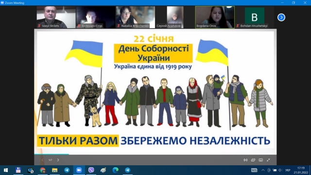 Доцент кафедри міжнародних відносин і суспільних наук Сергій Асатуров наголосив на важливості відзначення Дня Соборності України в контексті національно-патріотичному вихованні сучасної молоді. Підтримала й продовжила цю ідею у своєму виступі і студентка групи МВ-19003 Богдана Орос, яка у своїй презентації «Тільки разом збережемо незалежність» наголосила на необхідності збереження єдності народу, нації, держави.