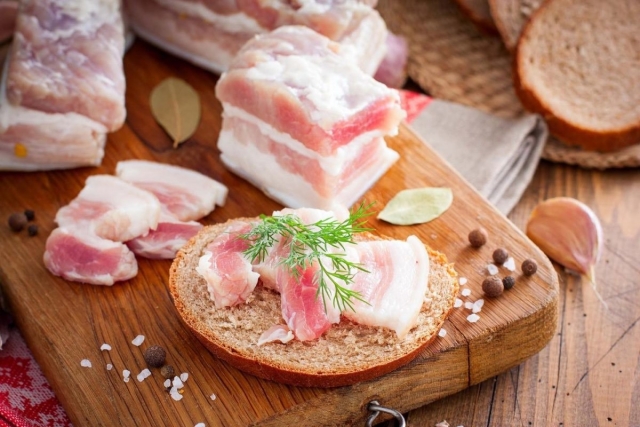На території України сало стало “їжею порятунку” за татарських набігів. Вживати свинину ворогам забороняла віра, і нашим предкам залишалося лише цим скористатися. Щоб захистити засіки з їжею від мусульман, місцеве населення розвішувало біля льохів шматки свинини у вигляді “полотен сала”, чим швидко відвадило завойовників. Зрештою навали позбулися, а сало залишилося – у статусі символу української кухні. На цей статус попрацювали і чумаки, які їздили на Дон, у Приазов’я і Крим за сіллю та рибою. “Чумацький шлях” до південних морів постачальники ярмаркового товару долали на волах і возах, тому влітку у спекотних степах могли харчуватися лише салом із сухарями, цибулею та пшоняною кашею. Відомо, що у найближчому до Азовського моря місті Слов’янську чумаки затарювалися топленим салом. Не обходилися без сала і запорізькі козаки: викопували в походах льохи та зберігали там свинячий жир, що не псується, для заправки кулешу. Користь чи шкода від сала? Всесвітня організація охорони здоров’я застерігає від надмірного вживання сала через його холестериновий компонент, який загрожує передчасною смертю від серцево-судинних захворювань. Оскільки сало в організмі тварини є поживним запасом, що містить тригліцериди, воно має насичені жирнокислотні залишки. Через це продукт періодично потрапляє в опалу до дієтологів, які називають його шкідливим для регулярного вживання. Але високий вміст вітамінів та корисних мікроелементів “реабілітує” сало у медичних рекомендаціях. Його визнано корисним через наявність у складі жиророзчинних вітамінів А, Є, D, F, а також арахідонової кислоти, природного антиоксиданту селену, ретинолу, кальцію, заліза, калію, фосфору, міді, натрію та цинку. Показаннями для вживання сала є цукровий діабет, хронічний бронхіт, туберкульоз легень, ревматизм, поліартрит та остеохондроз. Це профілактичний продукт для попередження онкологічних патологій, а в застуду – сильний засіб для зміцнення імунітету. Вживання сала позбавляє організм важких металів, а ще сало стимулює вироблення жовчі, налагоджує роботу шлунково-кишкового тракту, оздоровлює суглоби, зміцнює серцевий м’яз і чистить кровоносні судини. Однак найголовніше – не перевищувати норми споживання: від 10 до 30 грамів на день. Вживати сало дієтологи радять зранку, поєднуючи його з продуктами, що містять крохмаль (кукурудзяна каша чи картопля). Свинячий жир допомагає ліпше засвоюватися каротиноїдам, тож сало треба їсти з томатами, морквою та борщем. Сало також перешкоджає сп’янінню, якщо з’їсти шматочок перед вживанням алкоголю: цей продукт захищає шлунок від всмоктування етилового спирту. Але закушувати алкоголь салом не варто: це завдасть подвійного удару підшлунковій залозі. Обирати треба біле або трохи рожеве сало, проте в жодному разі не жовте: цей колір може бути ознакою кнура або окислення (старості). Щоб не помилитися із покупкою, сало треба нюхати. У жировому прошарку не буває гельмінтів, але якщо сало продається із вкрапленнями м’яса, його перед вживанням та приготуванням краще заморозити. Цінною перевагою сала можна вважати можливість швидкого насичення без тривалого приготування їжі. Калорійність свіжого сала – від 720 до 800 ккал на 100 грамів, а енергетична цінність солоного сала – до 820 ккал у 100 грамах. При цьому в салі зовсім немає загрозл