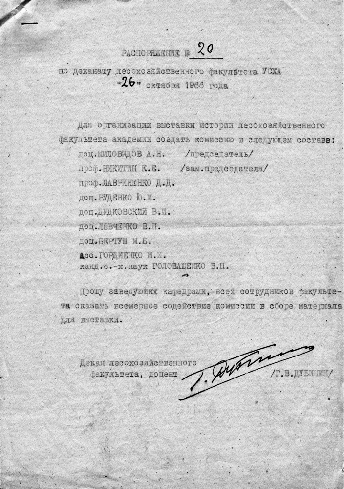 Розпорядженням № 20 від 26.10.1966 року декана лісогосподарського факультету доц. Г.В. Дубініна була створена комісія для організації виставки історії лісогосподарського факультету Української сільськогосподарської академії.