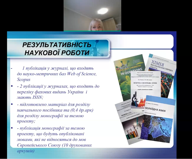 20. Тема НДР: «Використання нанофільтраційних методів для очищення водних розчинів від органічних сполук», № держреєстрації 0115U003400. Науковий керівник – к.х.н. Кочкодан Ольга. Строки виконання – 01.2015-12.2022