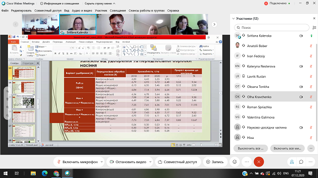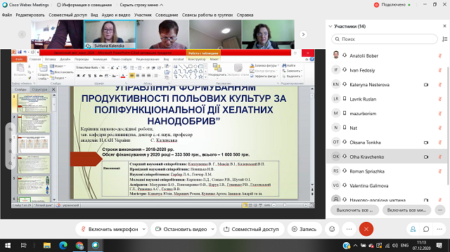 7 грудня 2020 року в НДІ рослинництва та грунтознавства відбулося онлайн засідання, щодо заслуховування проміжних та заключних звітів про науково-дослідну роботи, що фінансуються за рахунок Державного бюджету, а також ініціативних тематик за 2020 рік.