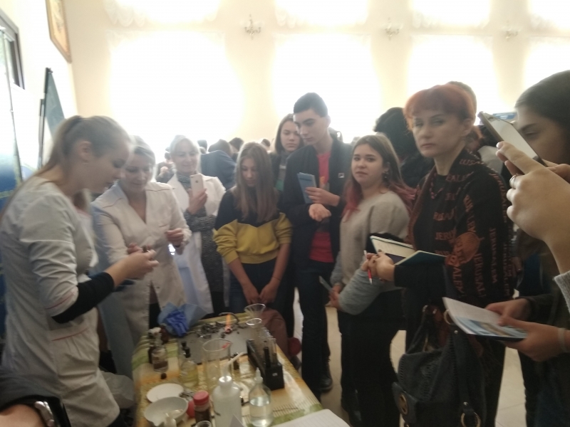 Дальше гості попрямували у 3 корпус, де на виставці-презентації факультетів були представлені на огляд здобутки наукової роботи гуртків факультету, а доценти кафедри загальної органічної та фізичної хімії Роман Жила та Надія Солод представляли хімічний експериментаріум.