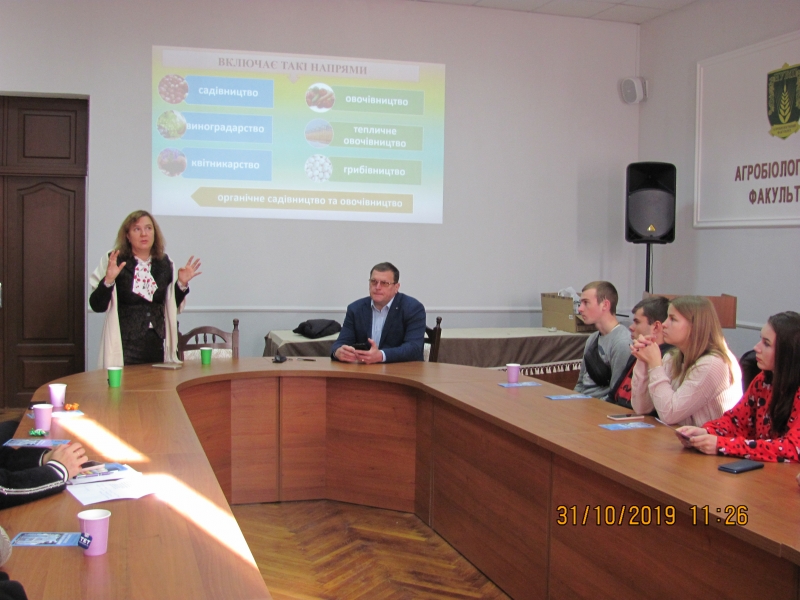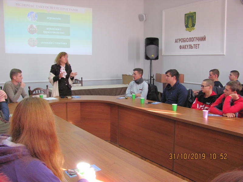 З вітальними словами до присутніх звернулася декан агробіологічного факультету Оксана Тонха, яка відмітила, що агробіологічний факультет є одним із провідних факультетів університету, а також серед агрономічних факультетів аграрних вузів України. Декан ознайомила гостей з історією факультету, його спеціальностями, термінами навчання, організацією навчального процесу, можливостями отримання подвійних дипломів та проходження практики за кордоном. Особливу увагу було закцентовано на ринку праці майбутніх фахівців з агрономії та садівництва і виноградарства.