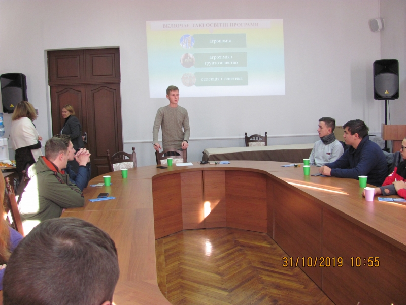 Голова студентської організації факультету Владислав Богданець розповів про студентський побут та дозвілля, наукові гуртки, як проходить студентське життя в університеті, про культурно-масові заходи, які відбуваються на факультеті та університеті і запросив гостей приєднуватися до дружньої родини НУБіП.