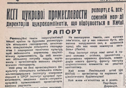 Сьогодні інформуємо нашу університетську спільноту про можливість ознайомитися з газетою «Агроіндустріалізатор». Як відомо, у 1930 р. КСГІ був ліквідований, а на його базі створено Київський сільськогосподарський інститут цукрової промисловості. Відповідно була започаткована і нова газета. З листопада 1931 р. часопис вже маркувався як «газета партколективу та профкому Київського агроінженерного інституту цукрової промисловості», а з березня 1934 р. – Агроінженерного інституту цукрової промисловості. Газета виходила протягом 1930-1934 рр. У 1935 р., внаслідок чергових структурних змін, було знову утворено Київський сільськогосподарський інститут.