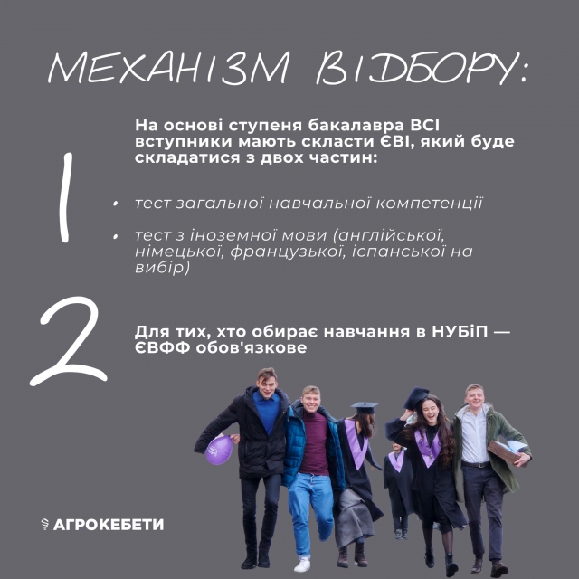 На основі ступеня бакалавра ВСІ вступники мають скласти ЄВІ (єдиний вступний іспит), який буде складатися з двох частин: