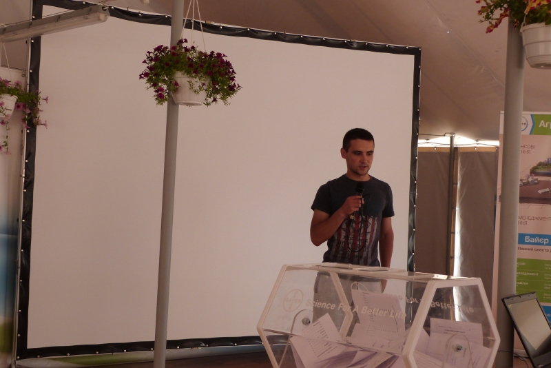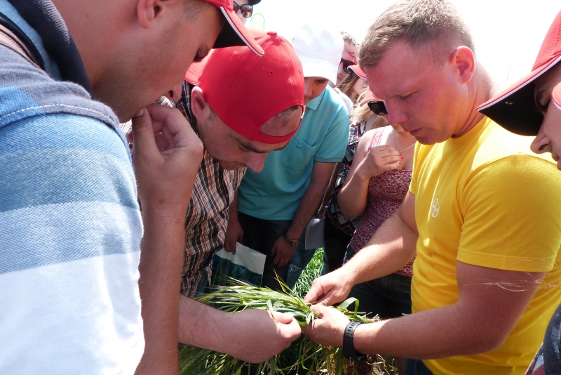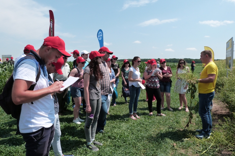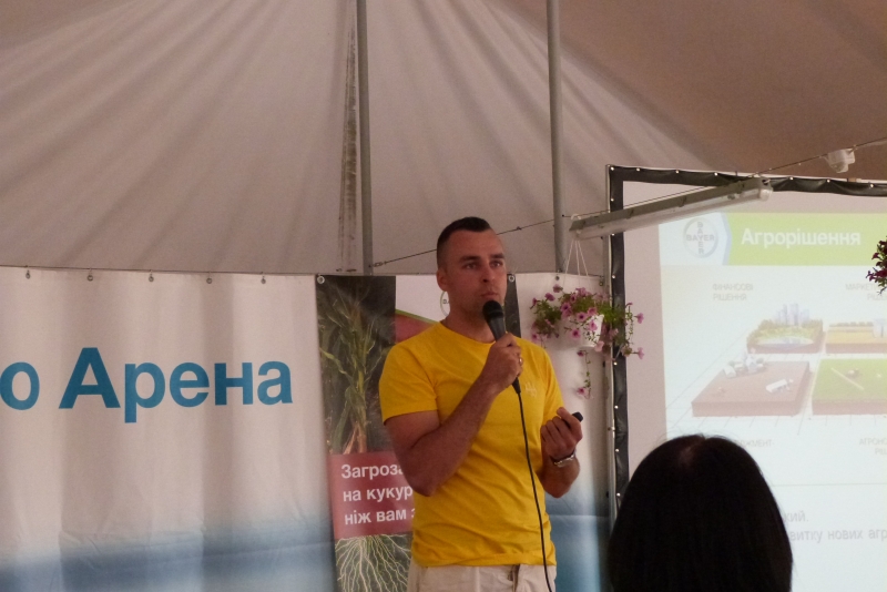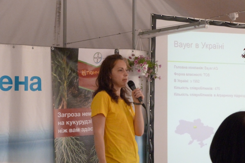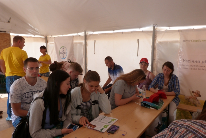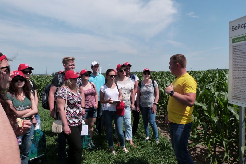 У межах дня поля Тетяна Мозгова, сommunications specialist, ознайомила студентів із стратегією розвитку компанії «Bayer» та її основними продуктами. Випускник агробіологічного факультету за спеціальністю «Агрохімія і грунтознаство», а нині менеджер із розвитку нових агрономічних рішень компанії «Bayer», Сергій Сичевський детально розкрив значення елементів точного землеробства у рослинництві і представив принципи роботи та переваги комп’ютерної програми «Bayer Фітосанмонітор», а також мобільного додатку «Bayer weeds cut». Крім того, фахівці «Bayer Агро Арена» продемонстрували посіви 7 культур: ріпаку озимого, кукурудзи на зерно, соняшника, буряка цукрового, сої, ячменю пивоварного, пшениці озимої. Розкрили технології вирощування цих культур компанії та особливу увагу звернули на систему захисту рослин.