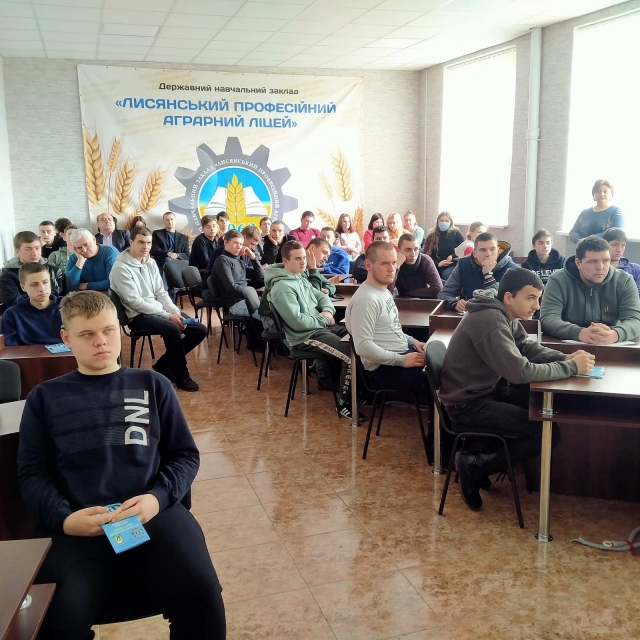 Наступною локацією для зустрічі став Комунальний опорний заклад "Лисянський навчально-виховний комплекс"–загальноосвітня школа І-ІІІ ступенів №1-гімназія. Директор школи Володимир Мельничук проінформував про тенденції розвитку навчального закладу. У своєму виступі представники університету закцентували увагу на перспективах працевлаштування після закінчення агробіологічного факультету, зокрема навіть на такій цікавій посаді, як агроном по газонах НСК «Олімпійський». Неабияк вразила 11-класників інформація про обсяги держзамовлення на спеціальностях факультету, яких у 2022 році для випускників шкіл буде аж 202. Приємно, що переважна більшість школярів володіє інформацією про наш ЗВО і багато їхніх друзів попередніх років випусків навчається у нашому університеті.