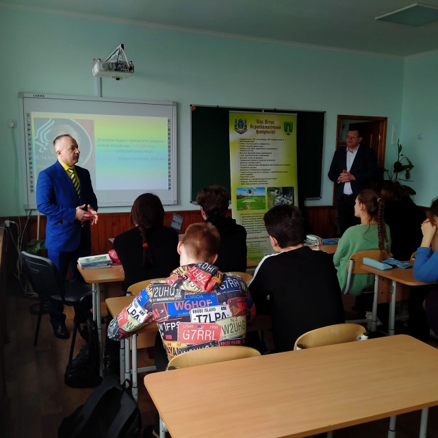 Лютий – надзвичайно відповідальний, і до певної міри визначальний, період у житті кожного молодого українця. Адже саме у цей місяць відбувається реєстрація для проходження ЗНО і від того, які предмети обере випускник, залежить які спеціальності можуть бути відкриті йому, як дорога у доросле професійне життя. Тому невипадково адміністрацією агробіологічного факультету саме у цей час була організована чергова профорієнтаційна поїздка. Цього разу заступник декана Віталій Коваленко, доцент кафедри овочівництва і закритого ґрунту Олександр Цизь і доцент кафедри загальної, органічної та фізичної хімії Роман Жила відправились в оспівану Тарасом Шевченком у поемі «Гайдамаки» Лисянку (нині Звенигородський район Черкаської області) для зустрічей із випускниками місцевих навчальних закладів.