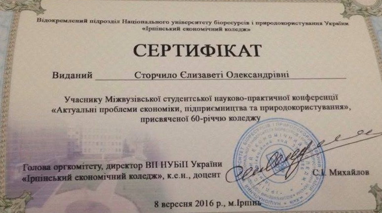 8 вересня студенти факультету харчових технологій та управління якістю продукції АПК кафедри стандартизації та сертифікації сільськогосподарської продукції прийняли участь у Міжвузівській науково-практичній студентській конференції «Актуальні питання економіки, підприємництва та природокористування», присвяченій 60-річчю відокремленому підрозділу Національного університету біоресурсів і природокористування України "Ірпінський економічний коледж".