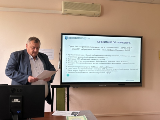 З доповіддю про діяльність кафедри маркетингу та міжнародної торгівлі за 2024–2025 навчальний рік виступив завідувач Валерій БОНДАРЕНКО. У своєму виступі професор акцентував увагу на реалізованих освітніх і наукових проєктах, міжнародній співпраці, зростанні публікаційної активності та оновленні навчальних курсів відповідно до сучасних викликів аграрного ринку. Окремо було визначено стратегічні цілі кафедри на 2025–2026 н.р., зокрема: підвищення якості освітнього контенту; залучення студентів до науково-дослідної роботи; розвиток англомовних програм та цифрових інструментів навчання.