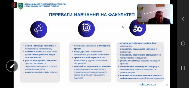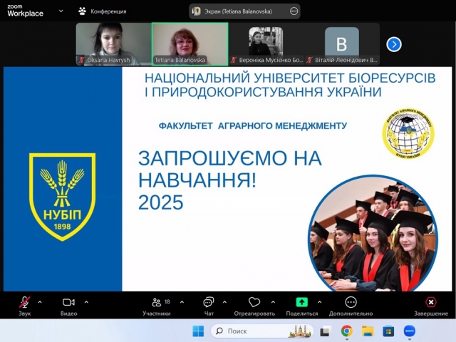 Для вступників шкіл та коледжів Київської, Сумської, та Закарпатської областей виступив у форматі онлайн завідувач кафедри економічної теорії Микола Талавиря. Він розповів вступникам не тільки про переваги навчання на факультеті аграрного менеджменту, але й про перспективи досліджень з біоекономіки у сучасному світі, зокрема, про світовий форум з біоекономіки у місті Найробі (Кенія) та про розвиток біоенергетичного потенціалу в сільському господарстві України. На кафедрі працює лабораторія, в якій ведуться відповідні наукові дослідження, і Микола Талавиря висловив впевненість, що майбутнім студентам буде цікаво долучитися до цієї важливої роботи .