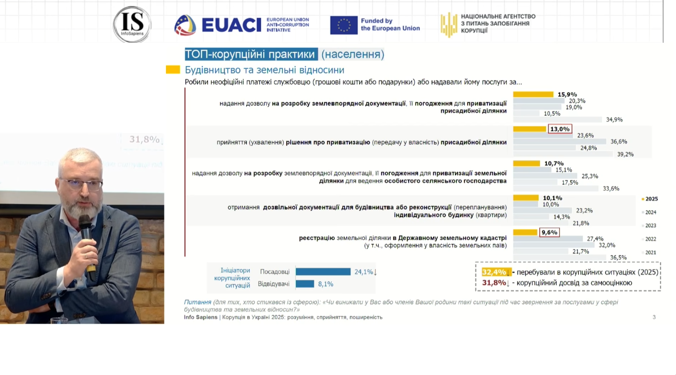 Оприлюднені НАЗК результати дослідження зафіксували важливу і водночас непросту тенденцію. З одного боку, у 2025 році в Україні зменшився рівень сприйняття поширеності корупції, який до того зростав у 2023–2024 роках. Реальний корупційний досвід населення і бізнесу також залишається суттєво нижчим, ніж суспільне уявлення про масштаб проблеми: про особисте зіткнення з корупцією повідомили 18,2% громадян і 20,6% представників бізнесу. З іншого боку, саме сфера будівництва та земельних відносин, за оцінками і населення, і бізнесу, знову виявилася найпроблемнішою: понад 30% респондентів із числа тих, хто контактував із нею, заявили про корупційний досвід. Отже, маємо водночас і добру новину, і серйозне попередження: загальний фон поступово поліпшується, але земельно-будівельний сектор досі залишається точкою найбільшої суспільної недовіри.