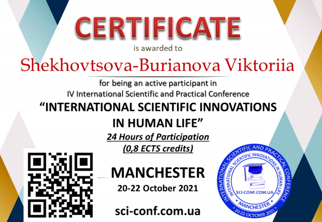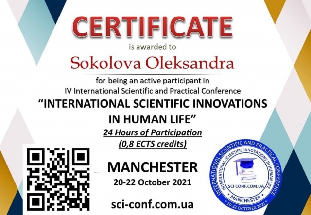 Зокрема, аспірантки Соколова О. та Шеховоцова-Бурянова В. прийняли участь у IV Міжнародній науково-практичній конференції «Міжнародні наукові інновації в житті людини», 20-22 жовтня 2021 року Манчестер, Великобританія.